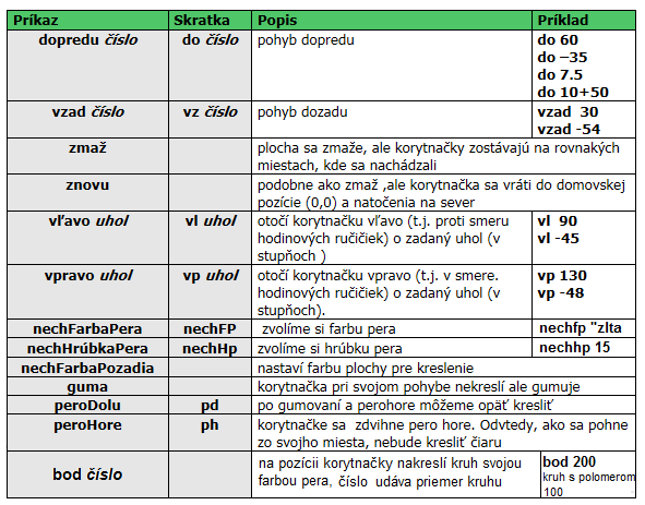 ZÁKLADNÉ PRÍKAZY PRE POHYB A KRESLENIE KORYTNAČKY
