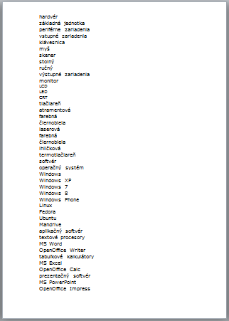 - do dokumentu vložte vždy na nový riadok jednu položku z budúceho zoznamu, zatiaľ bez číslovania, bez odrážok (ako vidíte na obr. vpravo)